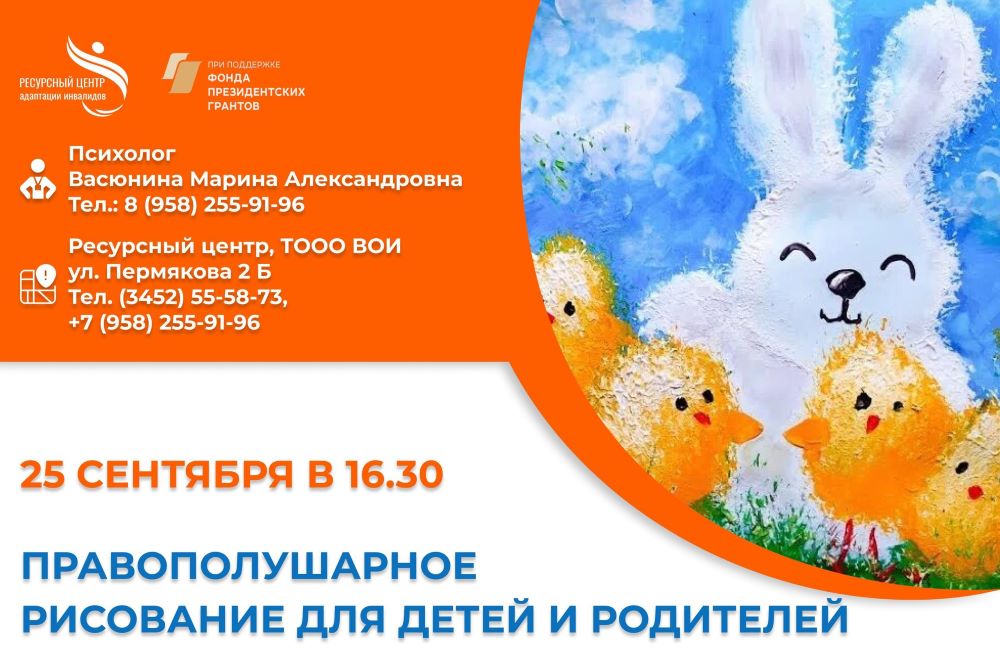 Ресурсный центр адаптации инвалидов приглашает детей (с 4-х до 8 лет) и их родителей 25 сентября в 16.30 на групповое арт-терапевтическое занятие по правополушарному рисованию.