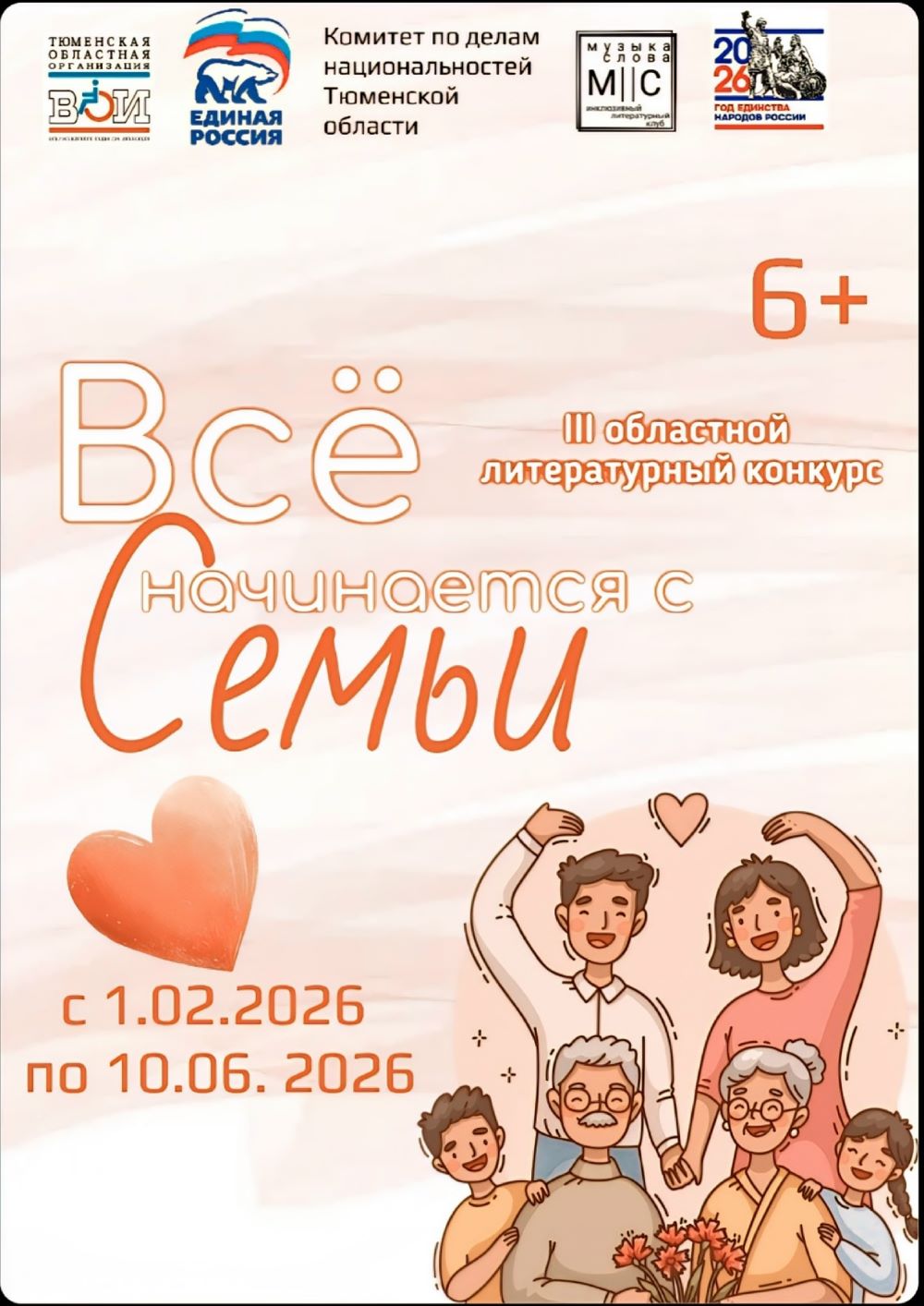Тюменская областная организация ВОИ и Инклюзивный литературный клуб «Музыка слова» (структурное подразделение ТООО ВОИ) при поддержке регионального отделения партии «Единая Россия» и Штаба общественной поддержки «Единой России» в Тюменской области проводят III областной литературный конкурс «Всё начинается с СЕМЬИ».